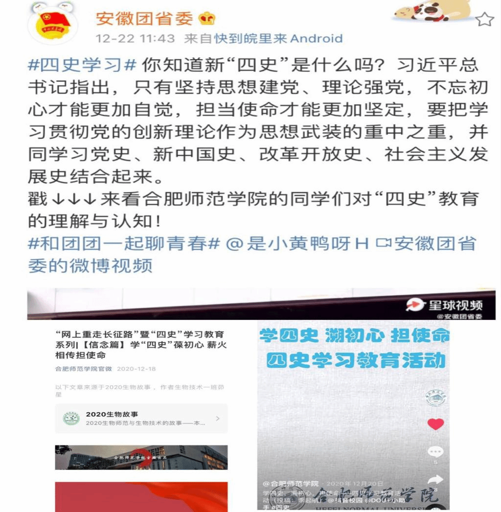微信公众号“2020生物故事”于2020年11月6日推送第1篇文章,目前共推送11篇。该公众号分为三个板块,分别为“生物人”、“生物科学”和“生物动态”。“生物人”主要介绍有影响力的生物科学家,了解科学家的故事,以此鼓励同学们以此为榜样砥砺奋进;“生物科学”科普一系列的动植物,通过有趣的介绍提高同学们探索大自然的兴趣;为濒临灭绝动植物发声,呼吁读者善待每一个生命;“生物动态”主要从思想引领,学风建设,党团活动等方面展现班级风采。其中,“学四史 保初心 薪火相传担使命”一文被“合肥师范学院官微”,“合师生科学生会”公众号转发,公众号内视频被“安徽省团委”微博,“合肥师范学院”官方抖音转发,取得了一定成效。