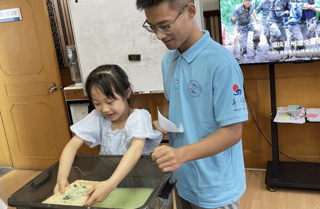 本网讯 7月7日,beat365正版唯一官网先诚行知学堂的4位小先生在安徽省教育考试院带领小学员共同开展主题活动“造纸术手工体验”。本次活动邀请了3位安徽农业大学的大学生共同进行造纸体验。