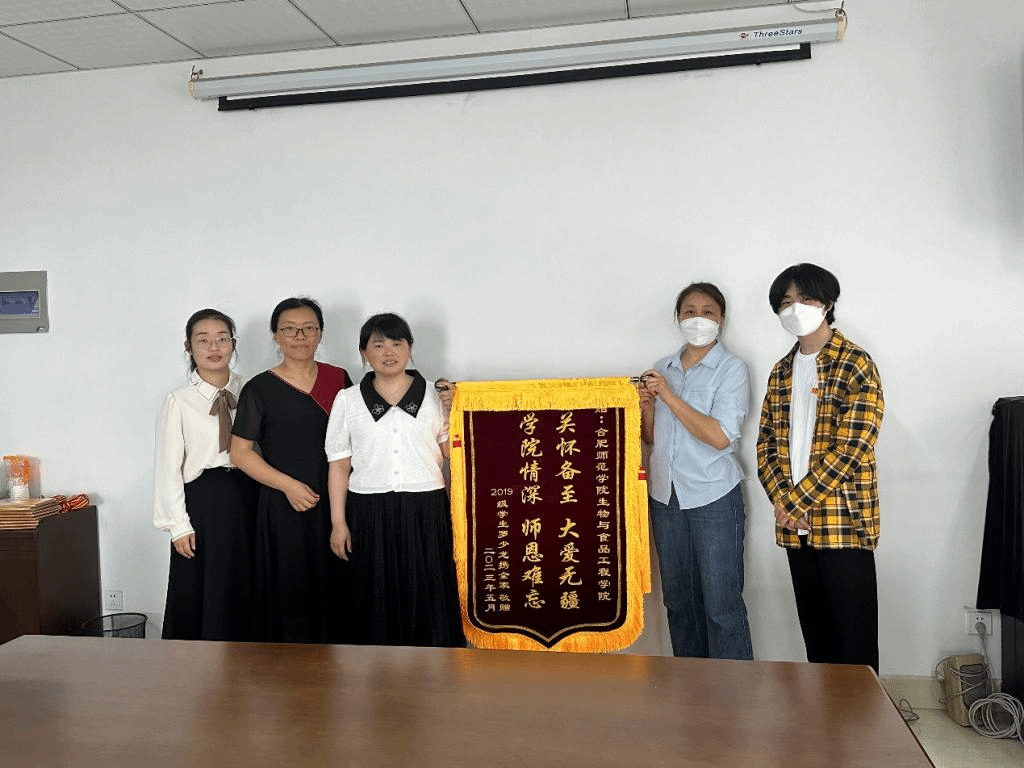 本网讯 5月18日,在行知楼1502室,beat365正版唯一官网2023届毕业生罗同学及家长满怀感恩之心,向学院赠送了写有“关怀备至,大爱无疆,学院情深,师恩难忘”的锦旗,以此表达对学院领导老师的感激之情。生物与食品工程程学院副院长朱桂兰、党委副书记杨娜和毕业班辅导员高欢热情接待了学生家长。