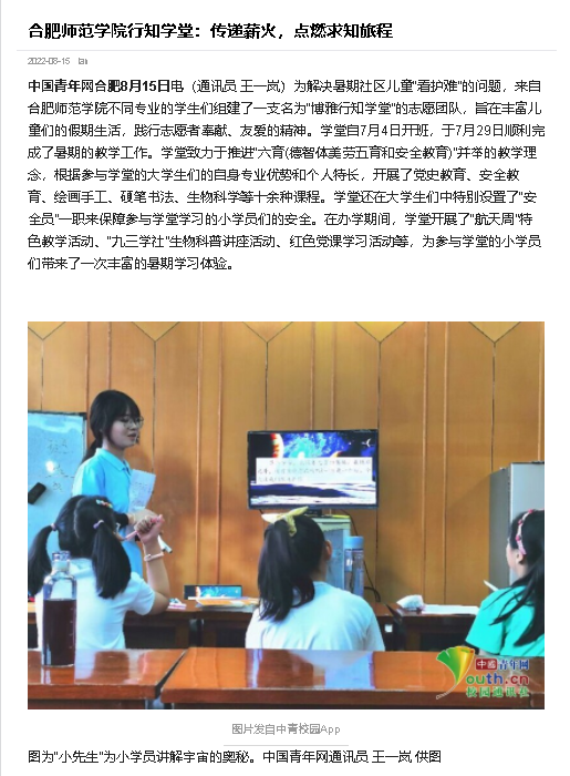 该学堂由学院赴省教育招生考试院挂职副教授王占军组建,并担任学堂指导教师。办学期间,开展了党史教育、安全教育、绘画手工、硬笔书法、生物科学等十余种课程,还开展了“航天周”特色教学活动、“九三学社”生物科普讲座活动、红色党课学习活动等,为参与学堂的小学员们带来了一次丰富的暑期学习体验。(生命科学学院)