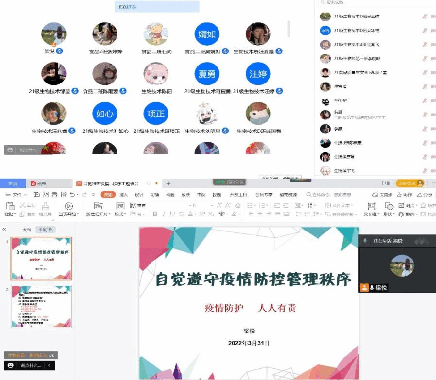 会上,辅导员带领同学们共同学习了《违反新冠疫情防控管理的行为及法律后果明白纸》,强化纪律意识;要求同学们积极配合核酸检测,做到“应检尽检”;强调坚持每日疫情防控信息打卡、非紧急不离校不离肥,特殊情况需严格履行请假手续;提醒同学们做好日常防护工作,按要求佩戴口罩,勤洗手,多通风;严禁翻爬围墙擅自进出学校,对于防疫信息不造谣、不信谣、不传谣;强调毕业班外出就业的同学要遵守防控规定,做好自我防护,增强安全意识和责任意识。同时,辅导员针对清明节放假和安全管理工作做了强调和说明,动员大家走下网络、走出宿舍,积极参加学院组织的“清明节”“拔河比赛”、“操场音乐会”等文体活动。