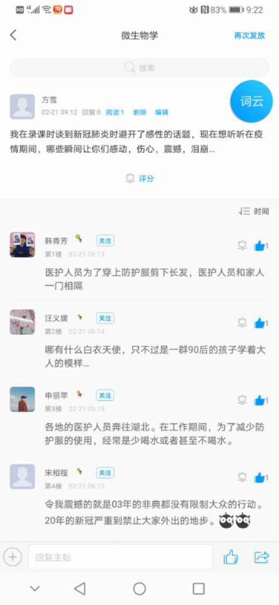 在课堂任务完成后,我提出了本次课的讨论主题“我在录课时谈到新冠肺炎时避开了感性的话题,现在想听听同学们在疫情期间,哪些瞬间让你们感动,伤心,震撼,泪崩……”,53位同学均在讨论区里分享了防控疫情期间的感人故事和动人画面。他们震撼于坚定自信的国家防控措施,众志成城的中国力量,“基建狂魔”的中国速度;感恩于84岁仍然挂帅出征的钟南山院士,“硬核医生”复旦大学附属华山医院感染科主任张文宏医生,安徽医科大学附属巢湖医院ICU凌云护士长等一线的医务工作者们;感动于已是大人模样的90后,爱心捐助的平凡人,接送医务人员的热心武汉市民,默默奉献的年轻志愿者……