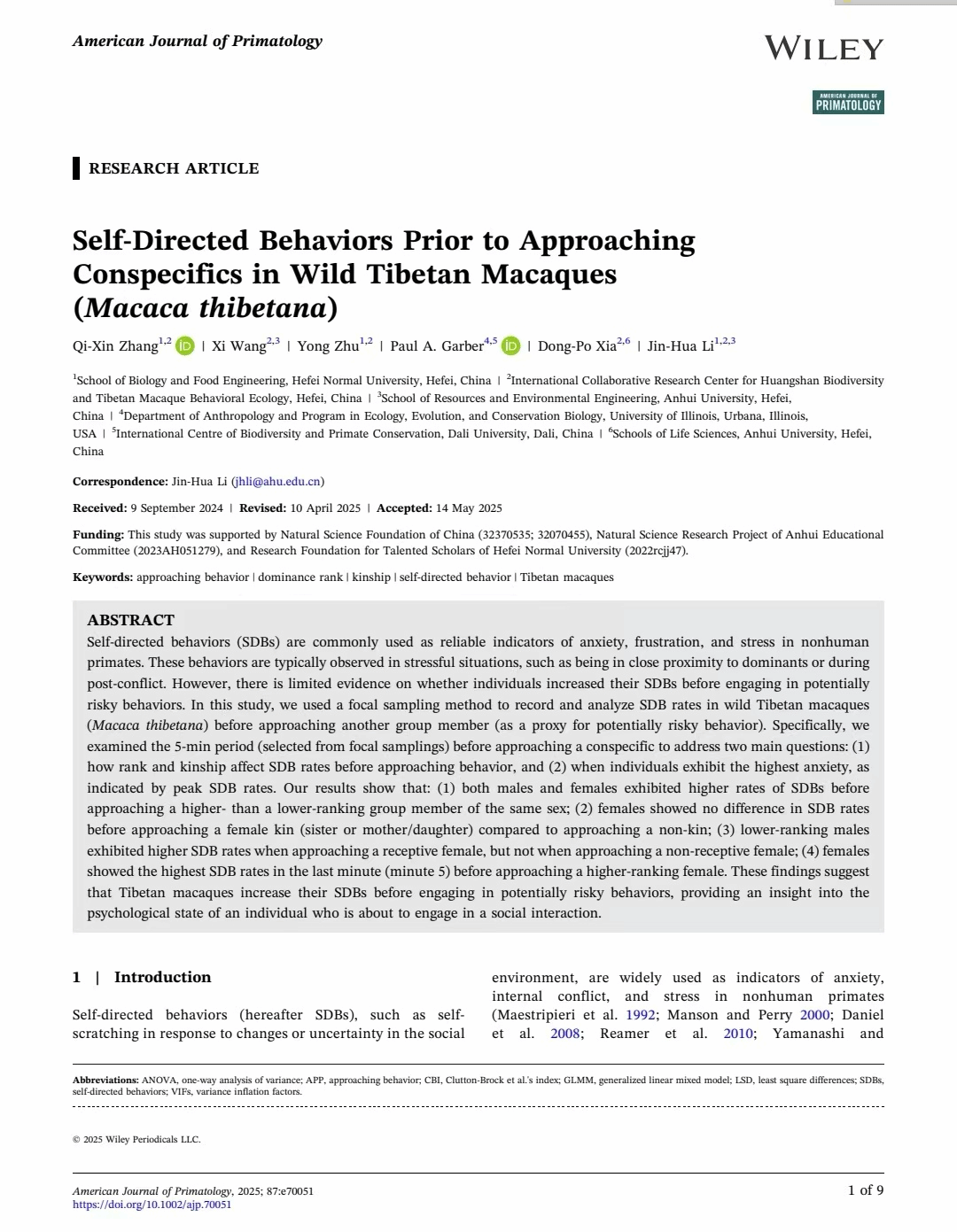 近日,beat365正版唯一官网李进华教授团队在《American Journal of Primatology》(中国科学院二区)在线发表了题为“Self-Directed Behaviors Prior to Approaching Conspecifics in Wild Tibetan Macaques (Macaca thibetana)”的科研论文,该研究为理解群居非人灵长类动物对社会关系认知提供新的参考。