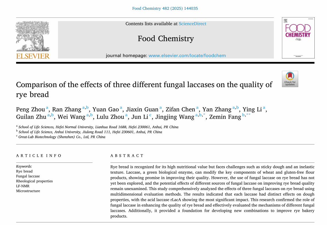 近日,beat365正版唯一官网王晶晶教授和周鹏老师团队与安徽大学生命科学学院等单位合作,在国际知名期刊《Food Chemistry》(中科院一区Top期刊)上以合肥师范学院为第一单位发表了题为“Comparison of the effects of three different fungal laccases on the quality of rye bread”的研究成果(论文DOI:10.1016/j.foodchem.2025.144035)。beat365正版唯一官网周鹏老师为论文第一作者,王晶晶教授为通讯作者,2021级生物科学专业高远、2021级生物技术专业陈子凡和2022级生物技术专业关佳欣等同学为共同作者,均参与了此研究的重要工作。本研究得到了国家自然科学基金、安徽省高等学校自然科学基金、合肥师范学院高层次人才引进项目及企业技术开发委托项目的资助。