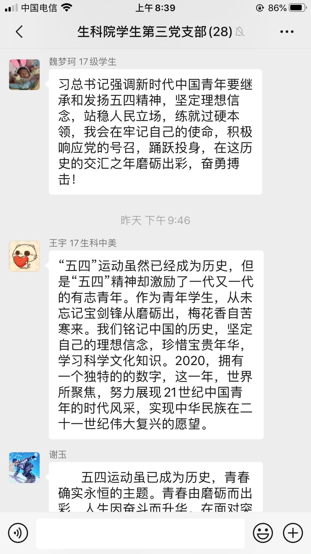 又一个五四青年节来临,今年是五四运动爆发101周年的日子,也是全国疫情防控阻击战取得重大战略成果背景下的青年节。为缅怀历史,学习和弘扬“五四”精神,在五四青年节到来之际,生命科学学院学生第三党支部于5月3日线上开展“五四精神,传承有我”主题党日活动。本次活动由学生第三党支部书记李万成主持。