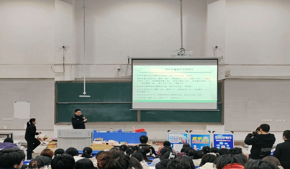 防诈安全专题宣传筑牢防火墙。开学以来,辅导员在各班级均开展了一次反诈专题宣传,做到了反诈安全工作全覆盖。3月6日下午,特邀合肥市公安局锦绣派出所警官李玉成在锦绣校区逸夫楼西阶教室开展“防范电信诈骗”专题讲座,讲座由辅导员徐浩然主持,全体辅导员和200余名学生聆听了讲座。李玉成警官结合辖区发生的真实诈骗案例,通过剖析网络刷单、虚构活动中奖、网络交友诈骗、网络游戏诈骗、杀猪盘诈骗等常见的诈骗手段,详细介绍了电信网络诈骗的基本类型和防范手段,揭露了诈骗分子惯用的作案伎俩,让同学们对电信网络诈骗的各种圈套有了更加清晰的认识,进一步提高了同学们对各类电信网络诈骗的鉴别力和反诈能力。
