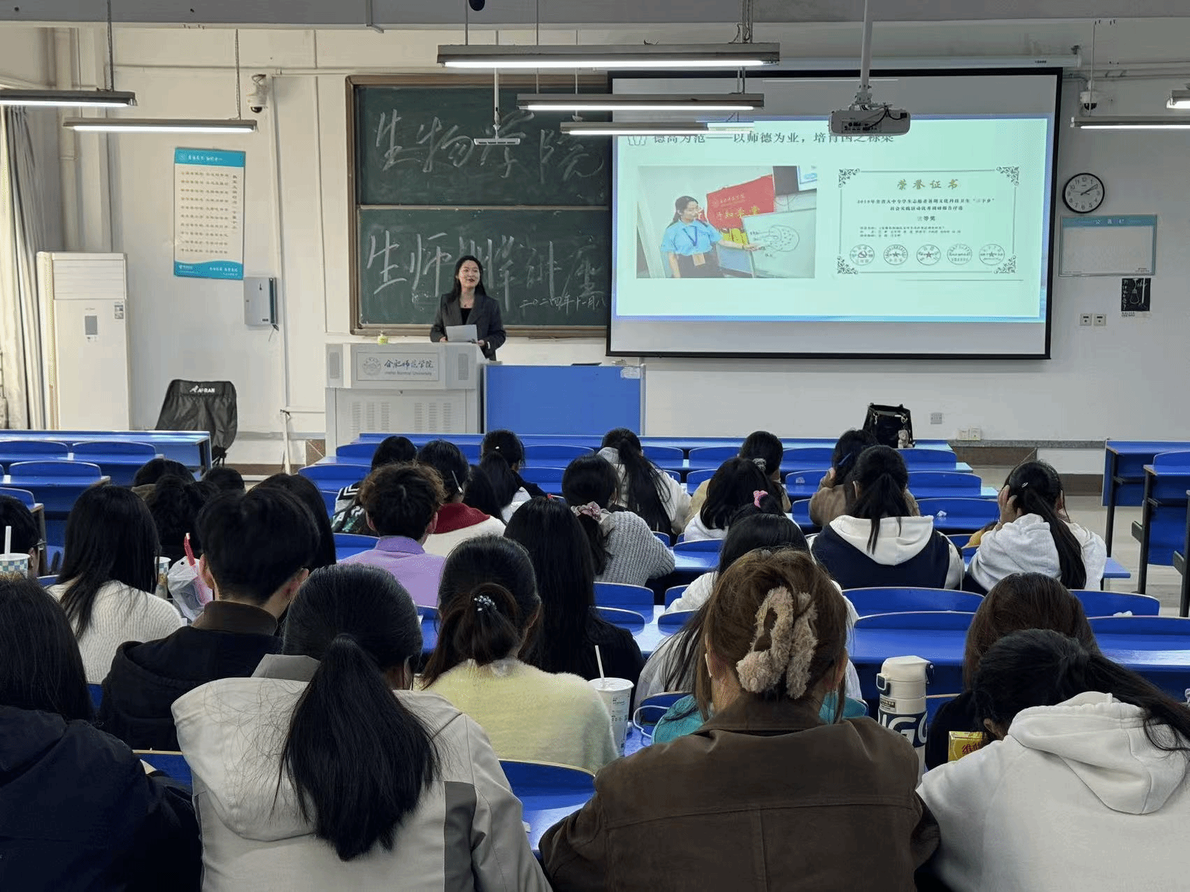 为全面贯彻党的教育方针和习近平总书记关于教育的重要论述,进一步营造“勤习慎思、品学兼优”的学习氛围,11月8日,beat365正版唯一官网在逸夫楼A107举办第一期“‘奖’给你听”学风建设主题讲座。本次讲座邀请了我校2022届生物科学(师范)毕业生党员、南京师范大学硕士生、无锡市洛社高中生物教师辛淑静校友,beat365正版唯一官网2023级师范专业全体学生听取讲座,讲座由学生第二党支部书记、辅导员徐浩然主持。