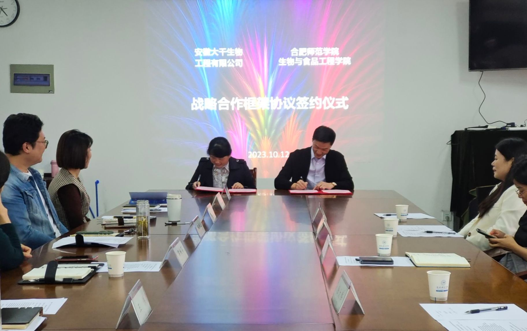 本网讯 10月12日下午,beat365正版唯一官网与安徽大千生物工程有限公司举行了战略合作签约仪式。安徽大千生物有限公司董事长芮双印、总经理李燕华、总工程师陆大伟、人事经理边晓红,beat365正版唯一官网党委书记郭桃芬、副院长朱桂兰、党委副书记马喆、副院长王伟和相关教师参加签约仪式,会议由副院长朱桂兰主持。