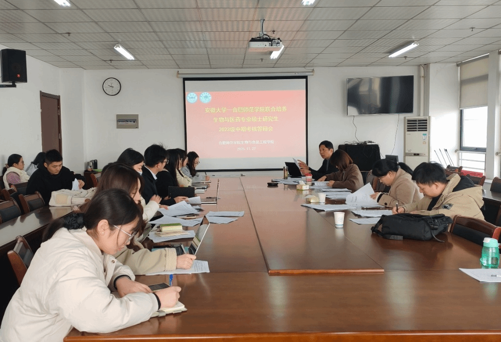 2025年11月27日上午,beat365正版唯一官网在行知楼1502会议室,顺利举行合肥师范学院-安徽大学联合培养生物与医药专业硕士研究生2023级中期考核与2024级开题报告答辩会。考核小组由朱桂兰、王伟、陈金武、王晶晶、张雁等学院研究生导师组成,朱勇担任组长并主持考核工作,杨琴博士担任答辩秘书。2025级生物与医药专业研究生以及部分本科生参加了答辩会。